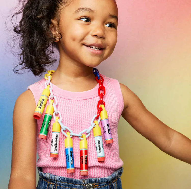 It’s A Good Week To Have A Good Week!The Days of the Week Lip Balm brings a new dose of fun to everyday! From a Monday jolt of lemon to a sweet Friday cherry treat, you’ll always have something to look forward to. 7 fruity flavors in 7 unique colors—beloved by both boys and girls! Comes with an adjustable rainbow chain necklace that you can add the lip balms to, individually or all together!