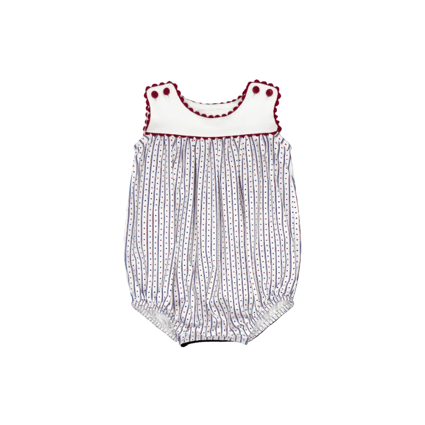Full of festive flair, the Charming Bubble in our All American knit print is perfect for patriotic celebrations and sunny summer days. This playful bubble features a soft knit fabric adorned with red ric rac trim and coordinating red buttons for an extra pop of charm. Designed for comfort and style, it's a star-spangled favorite for your little one's warm-weather wardrobe.