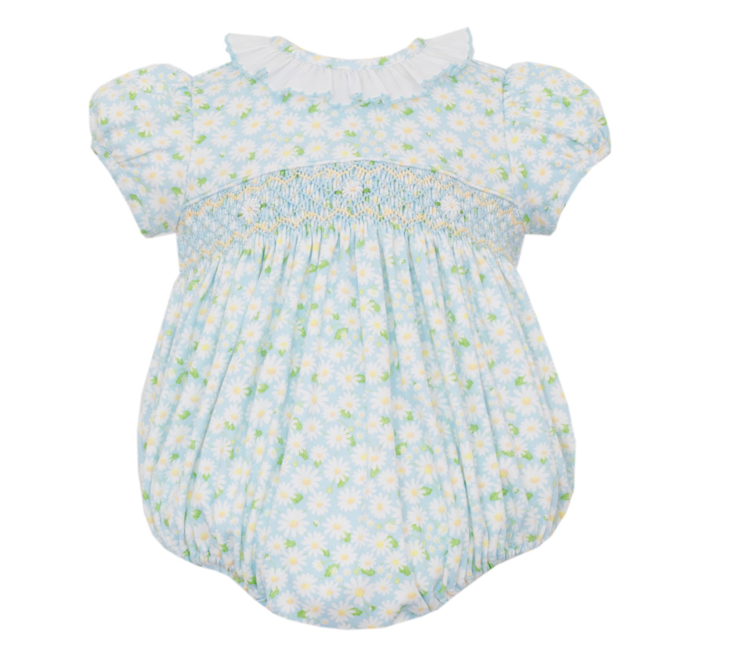 Spring Daises- Blue daises knit print girl's bubble with white ruffle collar